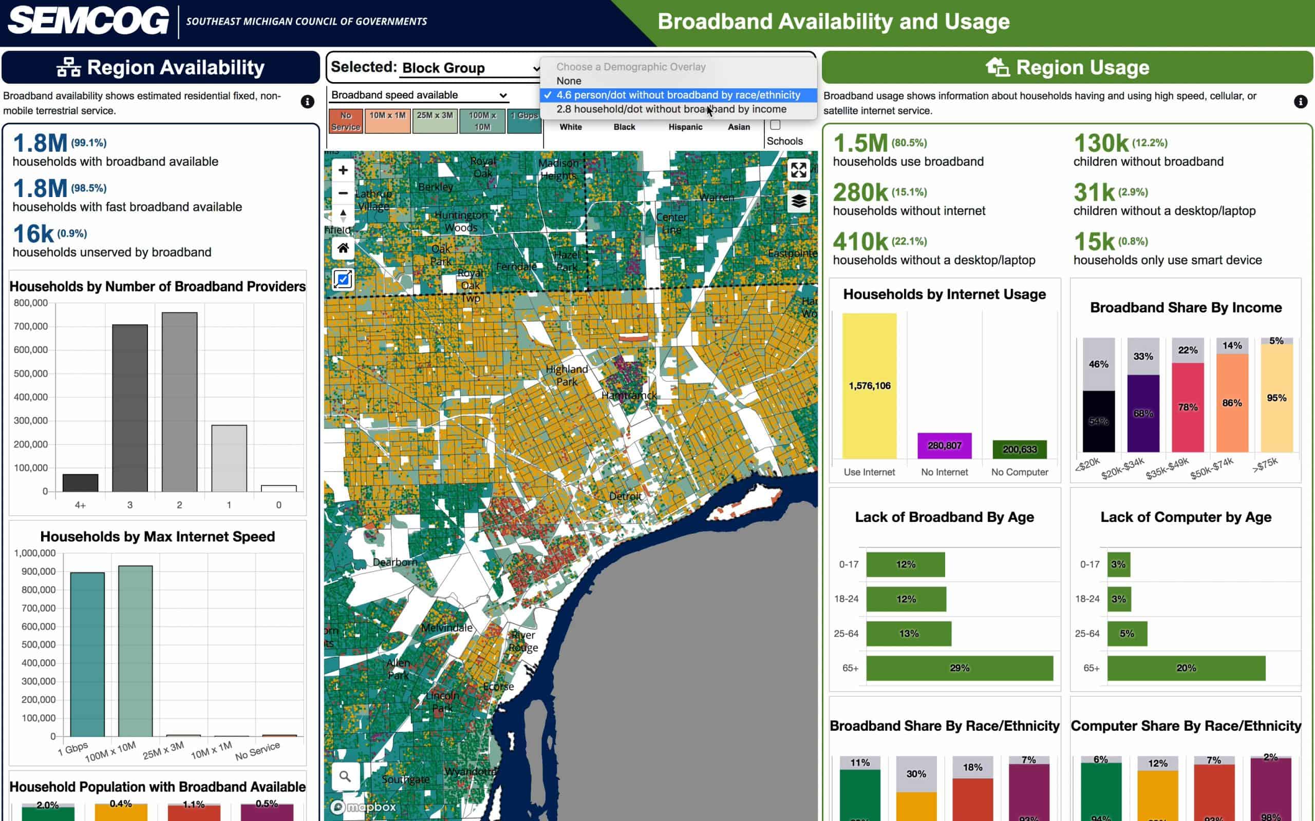 Whether folks use broadband to work from home or stream the latest Netflix series, this tool can help you make informed decisions that will best serve all populations. Expanding access to high-speed broadband will strengthen our economy, education system, and overall quality of life in Southeast Michigan; we created this tool to help support that endeavor.
