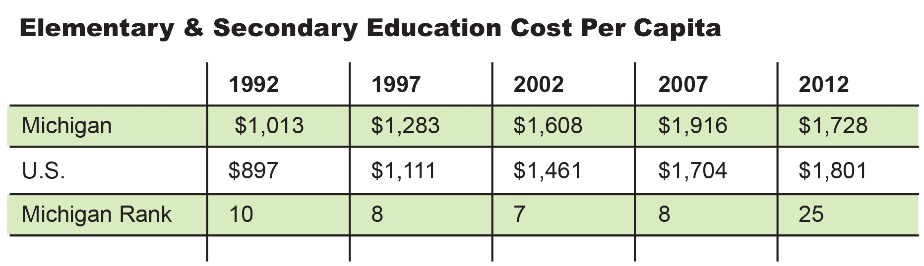 The U.S. Census figures for state and local expenditures for elementary and secondary education paint a very dramatic picture. In 1992, two years before enactment of Proposal A, Michigan ranked 10th in the nation in per capita expenditures for K-12 education. Once Proposal A passed, Michigan maintained its national standing in 1997, 2002, and 2007, with Michigan ranking 8th, 7th, and 8th respectively in per capita expenditures. However, by 2012, Michigan had changed drastically. Between 2007 and 2012, Michigan’s expenditures for K-12 education dropped 10 percent, dropping the state from 8th in the nation in expenditures to 25th.