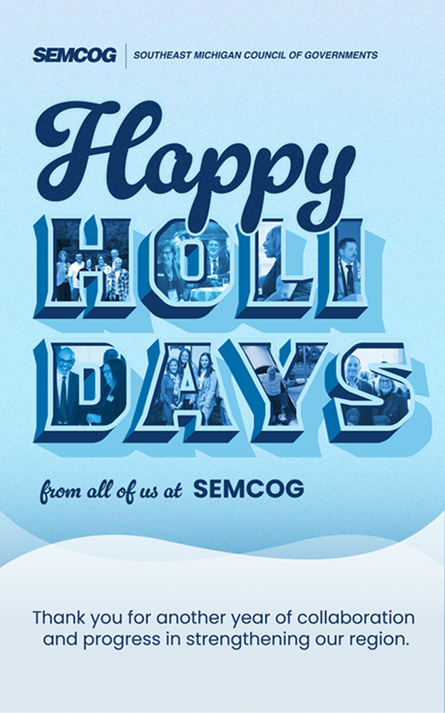 On behalf of the SEMCOG staff, I want to wish everyone in our regional community a peaceful, healthy, and joy-filled holiday season. We take pride in supporting smart decisions, but nothing SEMCOG does would be possible or have the same impact without your support and participation. We thank you for showing up for our region!