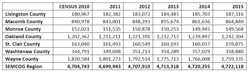 Population by County, Southeast Michigan, 2010-2015